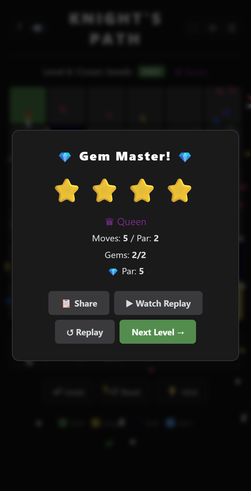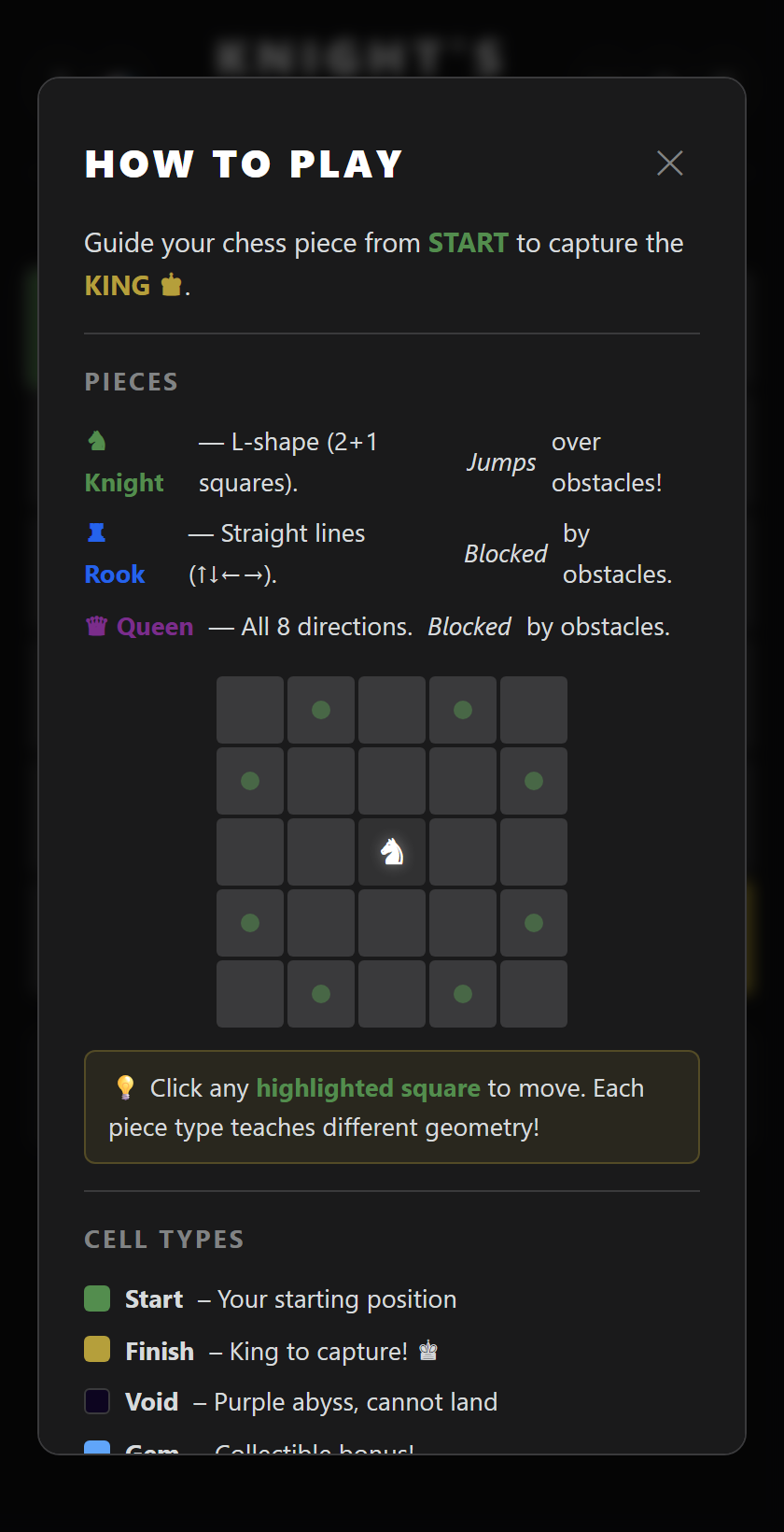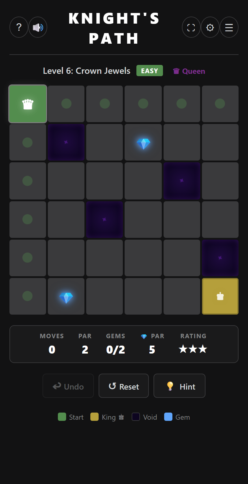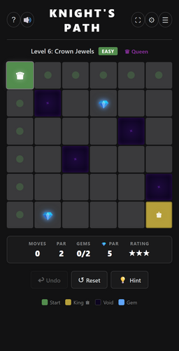 Move chess pieces through increasingly devious mazes — dodge threats, collect gems, and reach the King in the fewest moves possible. 161 hand-crafted levels across 7 worlds, from simple knight hops to brain-melting multi-mechanic challenges.
