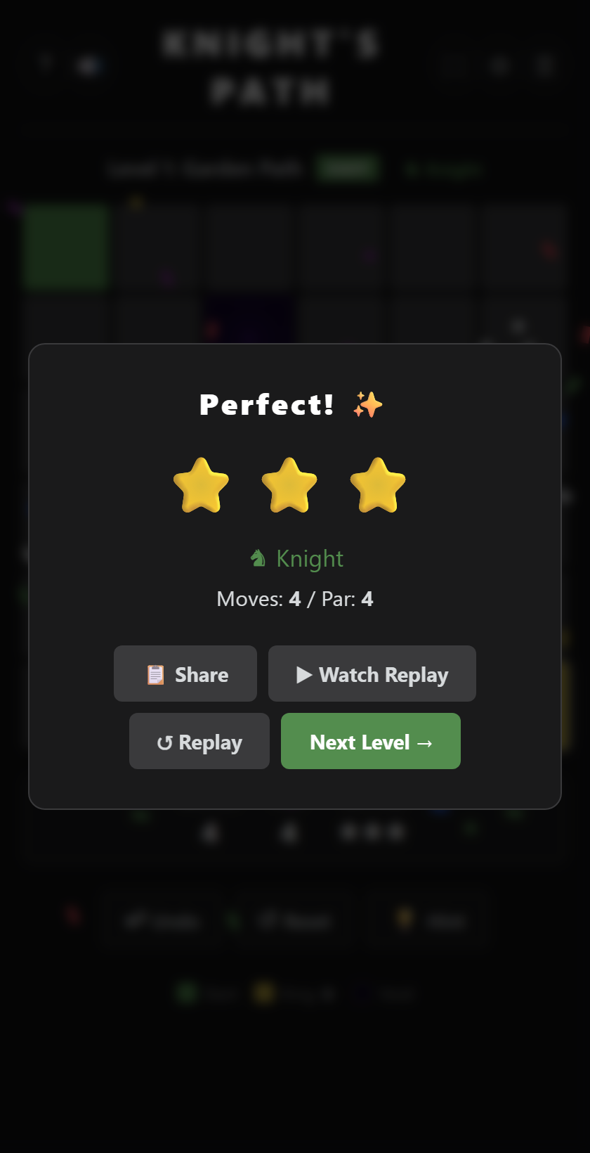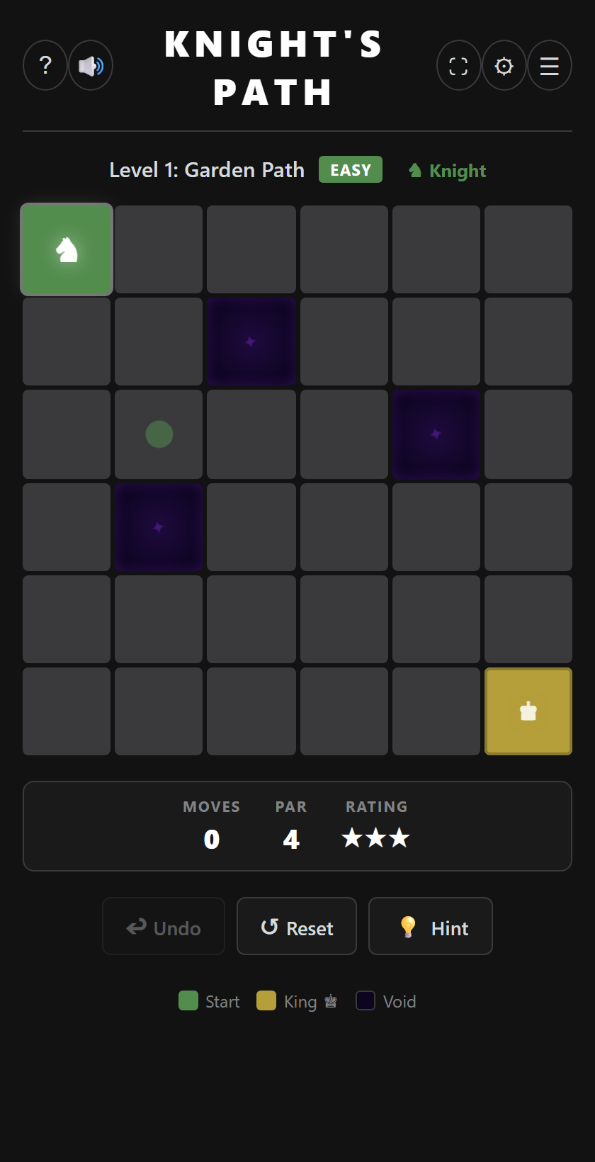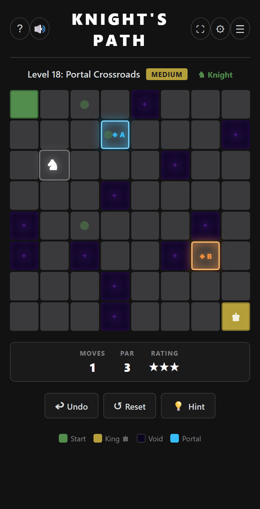 Move chess pieces through increasingly devious mazes — dodge threats, collect gems, and reach the King in the fewest moves possible. 161 hand-crafted levels across 7 worlds, from simple knight hops to brain-melting multi-mechanic challenges.